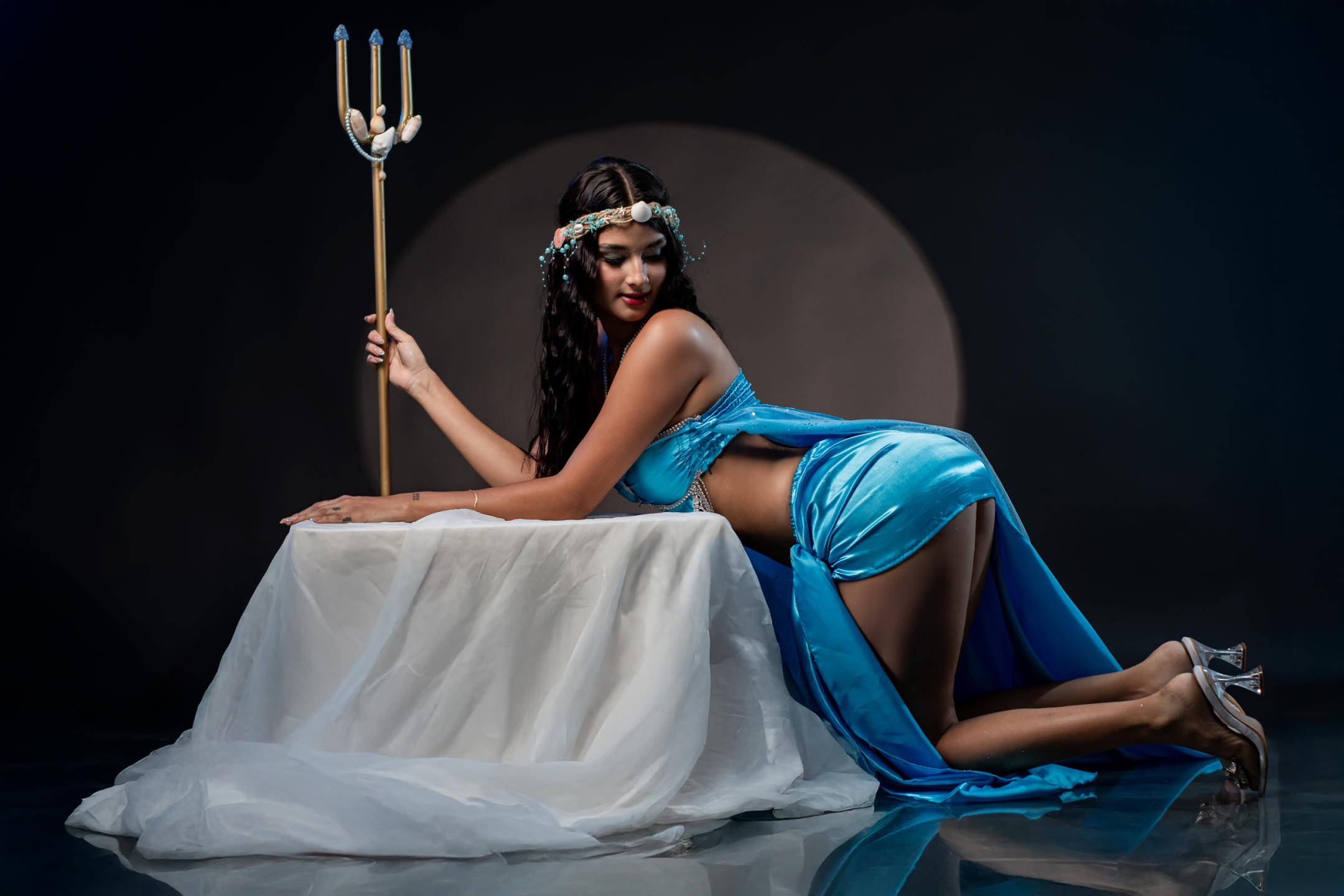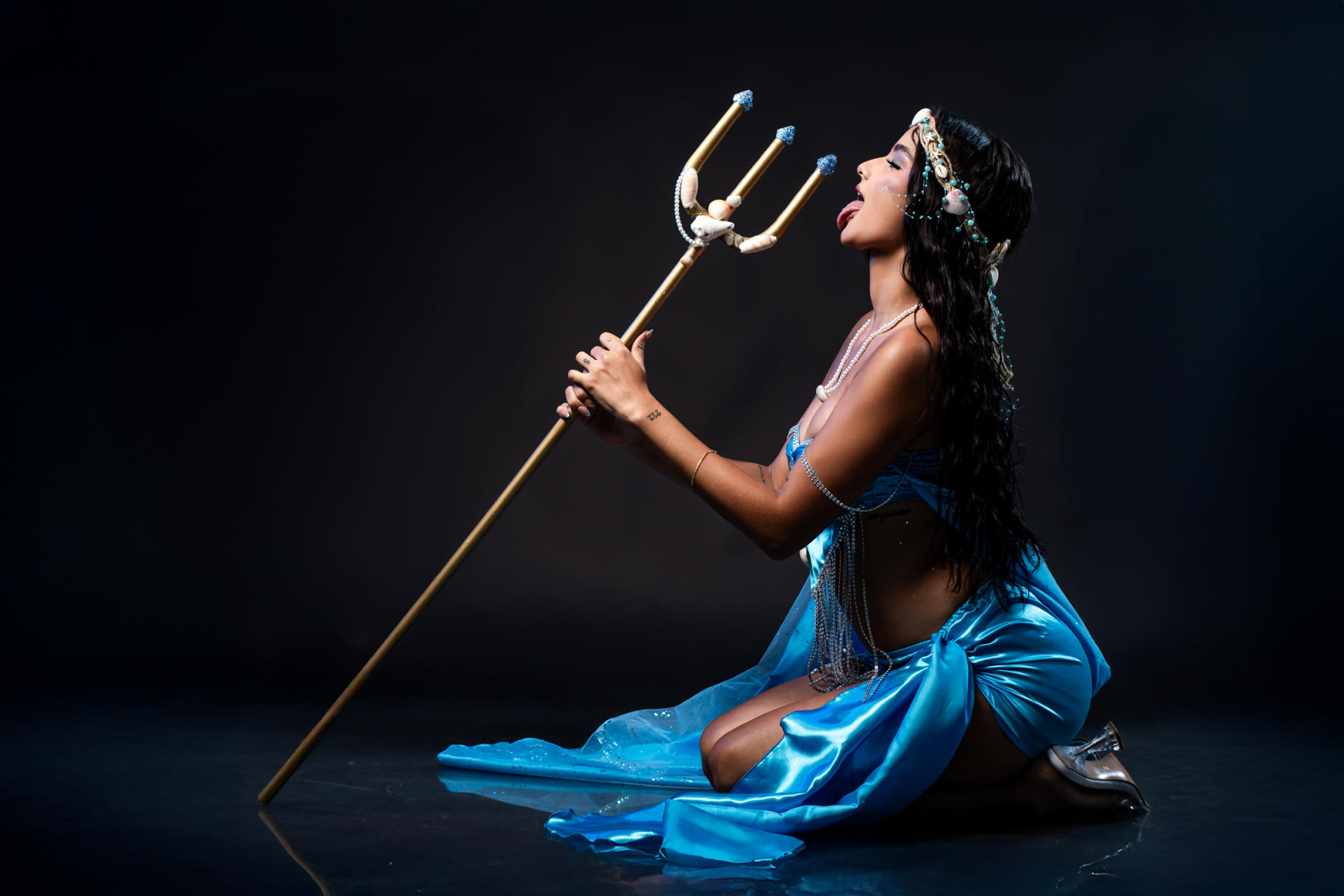 On his knees in front of you, staring at you with mischief. while you decide what's next.